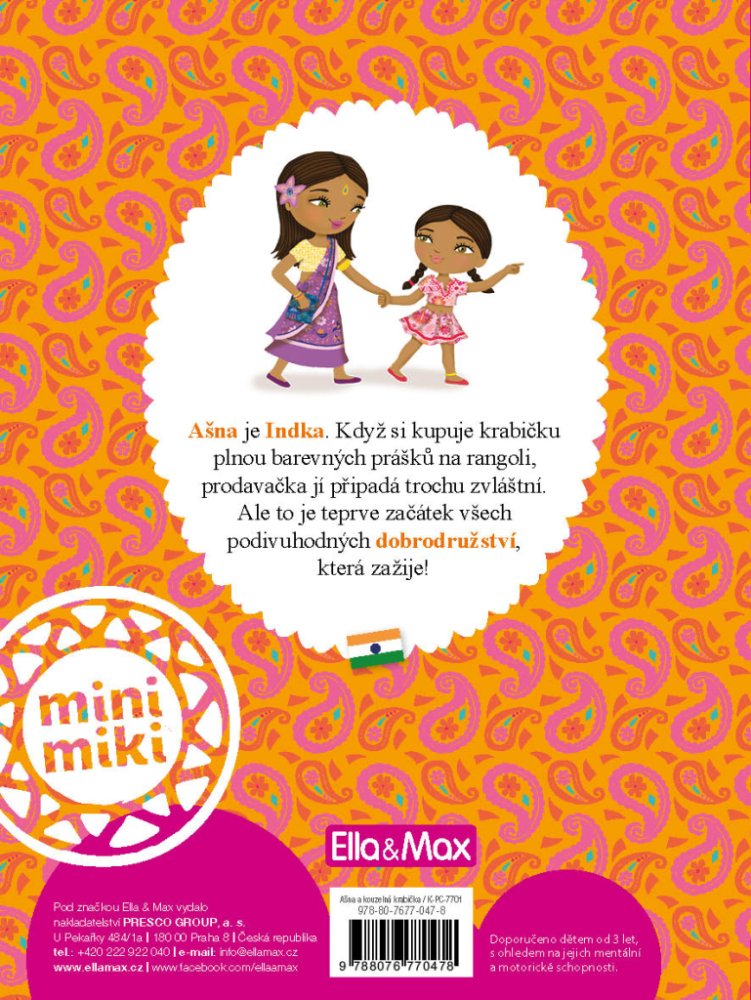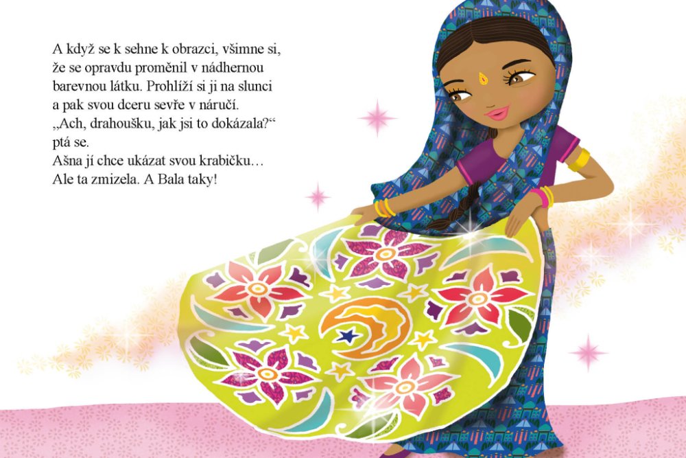 Ašna žije se svými rodiči v Indii. Každý týden pomáhá prodávat na trhu – za odměnu pak dostane peníze, které tu může utratit. Jednoho dne ji upoutá zvláštní stánek, kde se skví hromádky barevných prášků na rangoli, krásné obrazce, které se kreslí na zem před domem, aby nosily štěstí. Ašna si koupí krabičku plnou barevných prášků a začne tvořit nádherné vzory, které se mění v překrásné pestrobarevné látky. A to není všechno, co její kouzelná krabička s prášky dokáže!