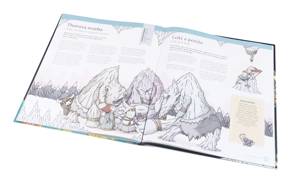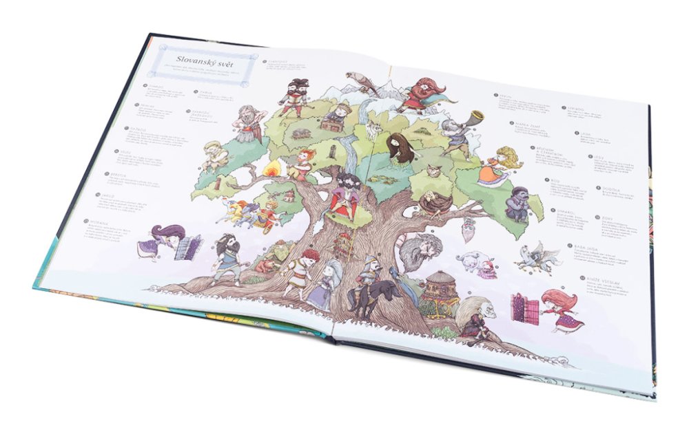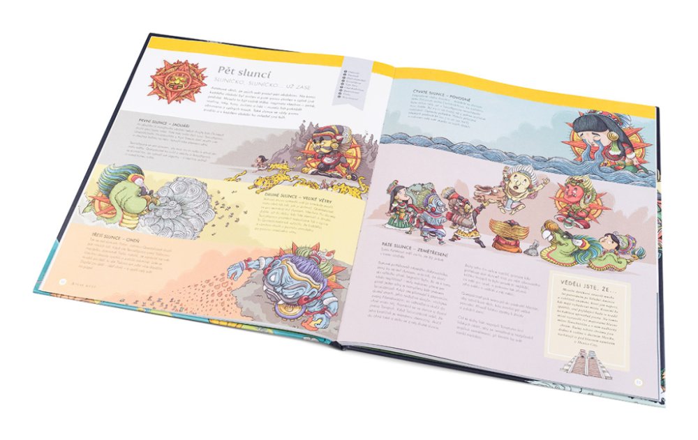Když si budete mapy prohlížet a číst příběhy, které je doprovázejí, procestujete zeměkouli křížem krážem. Poznáte, jaké legendy si vyprávěli původní obyvatelé severní Ameriky, jak nahlíželi na svět a jeho stvoření příslušníci úžasné civilizace Aztéků nebo domorodý kmen Janomamů v Amazonii. Hlouběji se seznámíte s řeckými mýty, dobře známými přinejmenším v celé Evropě, ale proniknete i do magického světa irských, severských či slovanských bohů. V Africe vás pohltí přízračný jorubský svět nebo rovněž světoznámé mýty starých Egypťanů. V Asii vám pak učarují hinduistické a japonské legendy a v Oceánii svět polynéských domorodých kultur.