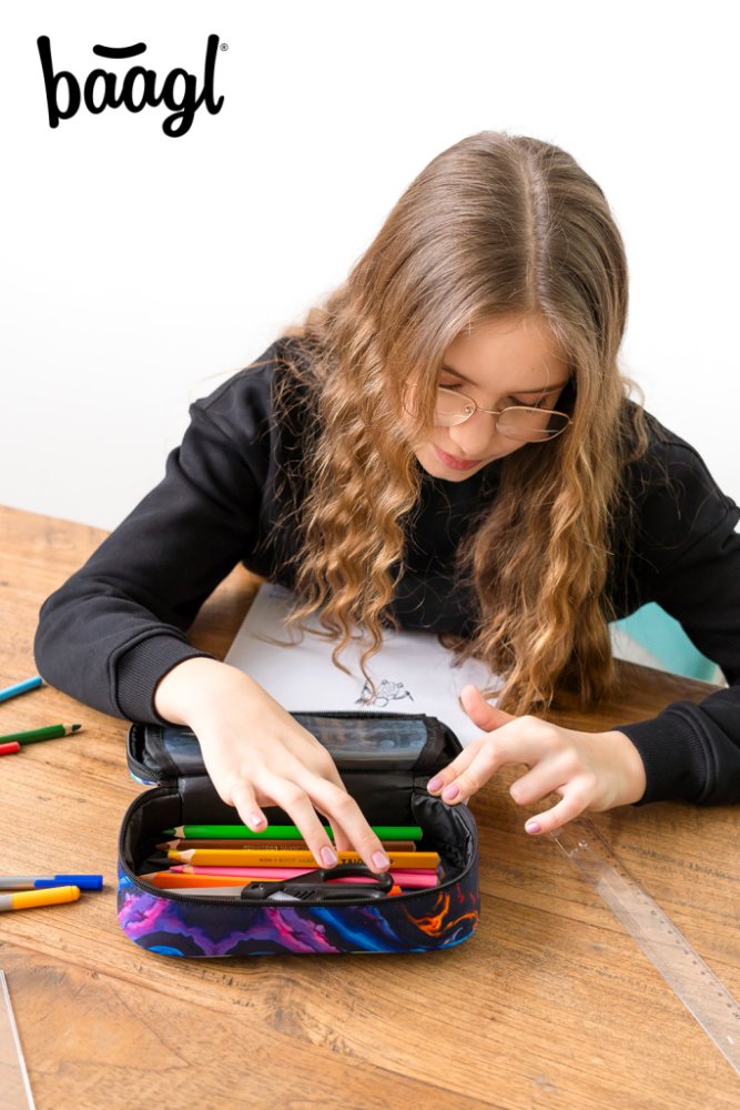• Pevný školní penál s výklopnou vnitřní přepážkou.