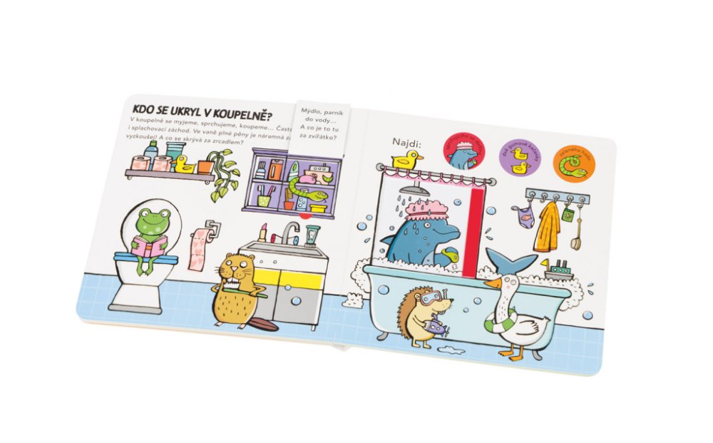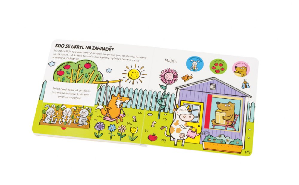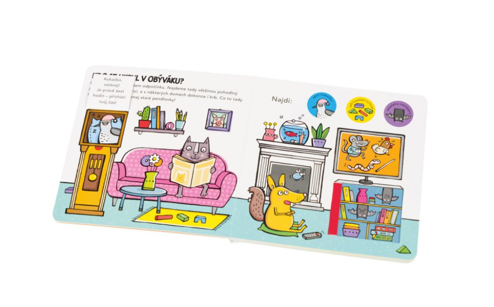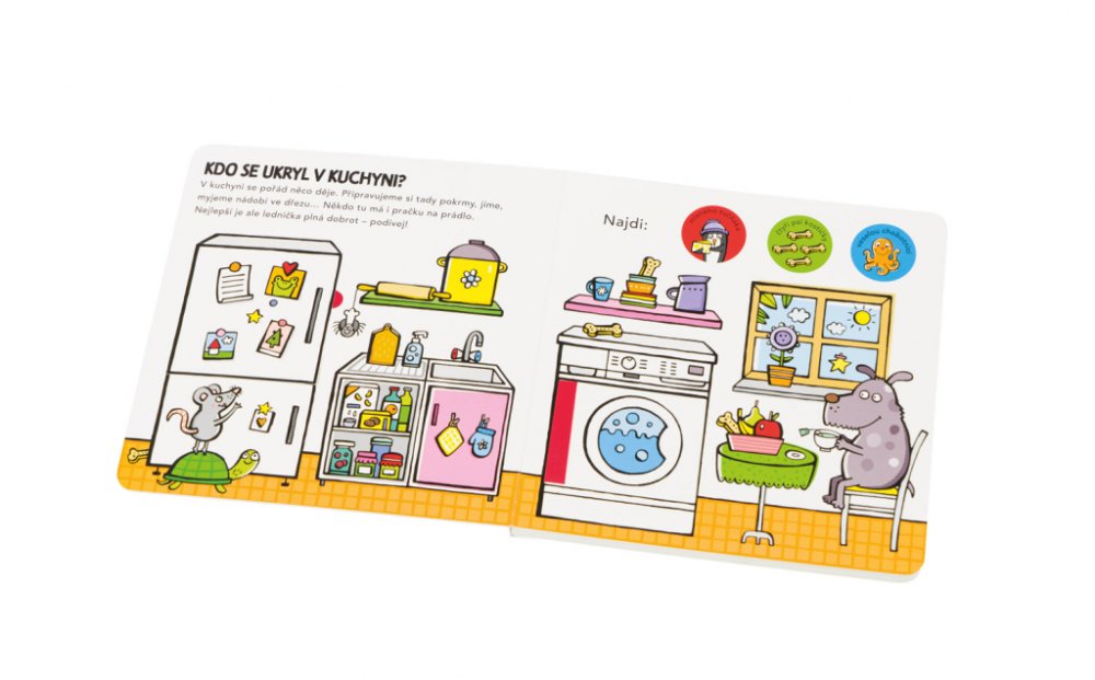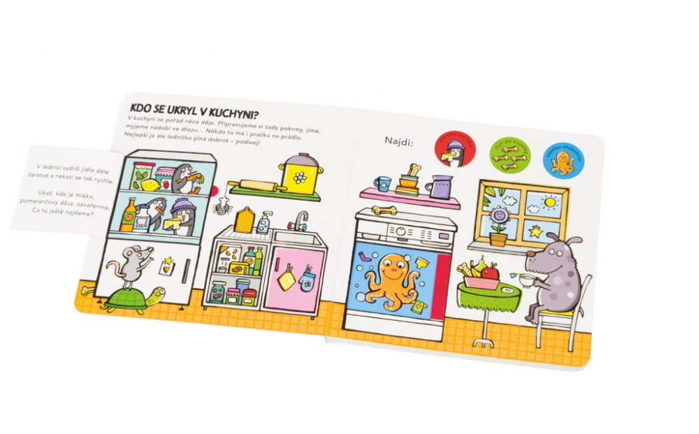 Oblíbený formát leporela s odklápěcími chlopněmi a posuvnými dvířky poskytuje malým čtenářům chytrou zábavu a zároveň utváří jejich představu o tom, jak to vypadá v jednotlivých místnostech v domě a k čemu tyto místnosti obvykle slouží. Práce s takovouto knihou přispívá rovněž ke zlepšování koordinace ruka – oko. Děti tu objevují zvířátka ukrytá v kuchyni, v obývacím pokoji, v pokojíku, v koupelně či na zahrádce a řeší jednoduché úkoly zaměřené na rozvoj pozornosti a základních matematických představ.