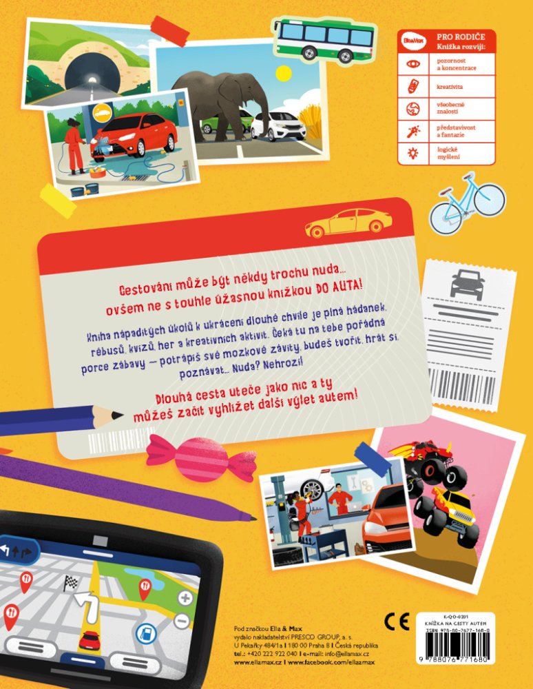 Cestování může být někdy trochu otrava… ovšem ne s touhle úžasnou knížkou DO AUTA, která je plná nápaditých úkolů k ukrácení dlouhých chvílí! Najdete v ní spoustu hádanek, zapeklitých rébusů, zábavných kvízů, her, kreativních aktivit i zajímavých informací z oblasti cestování autem. Čeká tu na vás pořádná porce zábavy – potrápíte své hlavičky, budete tvořit, hrát si, poznávat… Nuda? Nehrozí! Dlouhá cesta autem uteče jako nic a vy můžete začít vyhlížet další výlet! Práce s knihou navíc rozvíjí představivost, fantazii a kreativitu, ale také pozornost, koncentraci a logické myšlení.