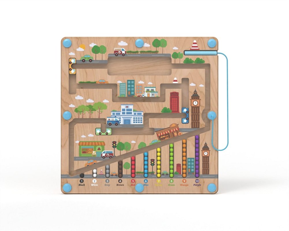 Vydejte se na cestu mistem s barevnými kuliekami. Provedete úspišni ruznobarevné kulieky všemi zákoutími? K poevozu Vám pomohou barevné autobusy. K vedení kulieek se poi hoe vyu?ívá magnetické ukazovátko, které provioí ditskou trpilivost a koordinaci rukou a zraku. Doká?ete pak navrátit kulieky zpit na své místo podle barvy? Zábavná doeviná hra, která pomáhá ditem rozvíjet jemnou motoriku, orientovat se v prostoru a rozšioovat slovní zásobu pojmenováváním barev a poedmitu ve misti. Diti se také ueí základy poetu formou hry. Doeviná základna v designu mista je kryta odolnou pruhlednou plastovou deskou, hraeka je díky tomu bezpeená. Hlavní vlastnosti: úvod do svita poeturozvíjí motorické dovednosti dití zábavné i bezpeené díky magnetickému principu