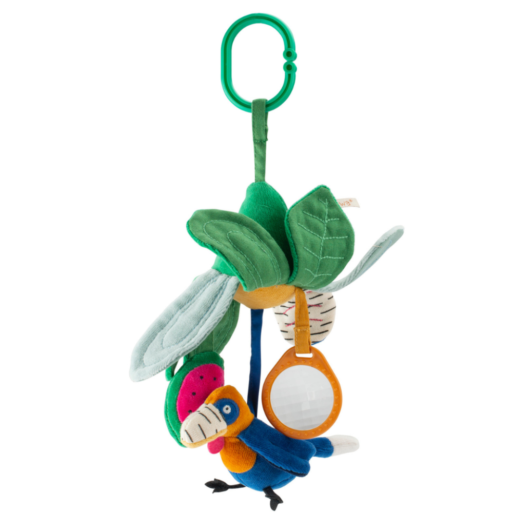 Závěsná aktivní květina zve miminko k objevování barev, zvuků i různých textur. Při doteku zazvoní rolnička, okvětní lístky jemně šustí a průhledný prvek umožňuje pozorovat svět novým způsobem. Ideální hračka na zavěšení ke kočárku nebo postýlce.