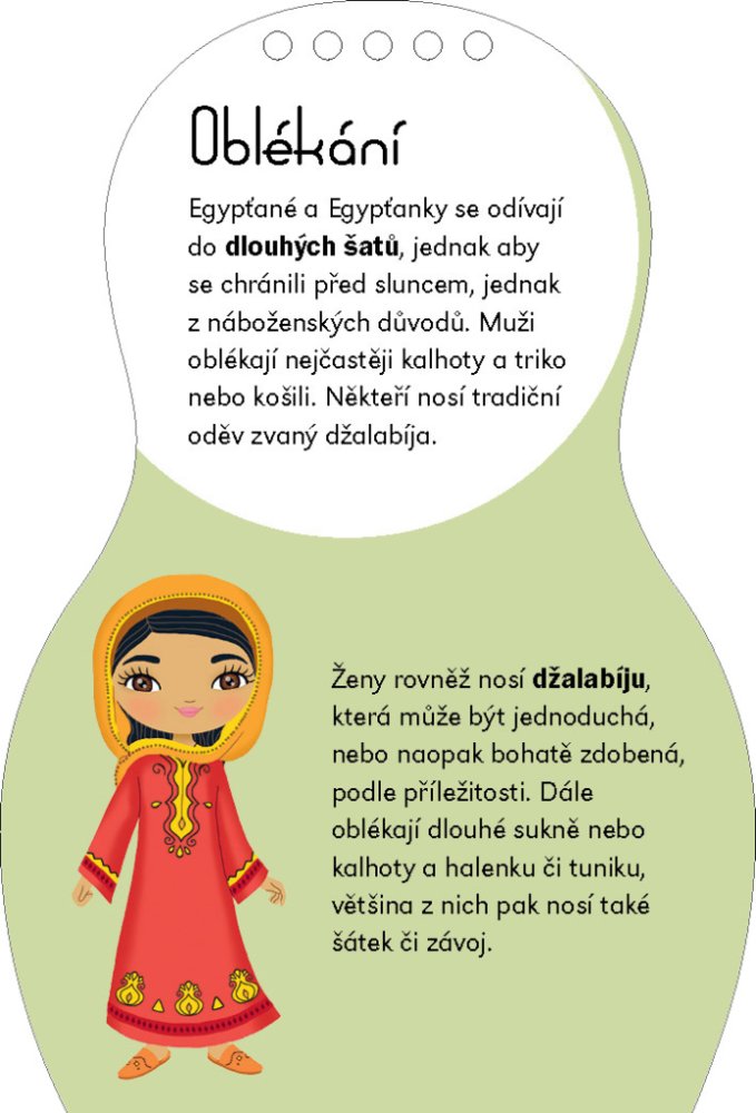 Další titul oblíbené série, která našla své obdivovatele v desítkách zemí světa, představuje malým čtenářům kouzlo Egypta prostřednictvím panenky Farah. Kreativní omalovánky, spousta samolepek… knížka obsahuje vše, co je třeba k vytvoření nesčetných modelů podle egyptské módy. A k tomu se děti dočtou i spoustu zajímavých informací navrch! Jak se jejich vrstevníci v Egyptě zdraví, jak se tam učí, na jakých specialitách si pochutnávají? Víte, co je to košarí nebo džalabíja? To a ještě mnohem víc se dozvíte, vydáte-li se za poznáním s našimi panenkami. A ke každé knížce dostanete krásný náramek pro štěstí!