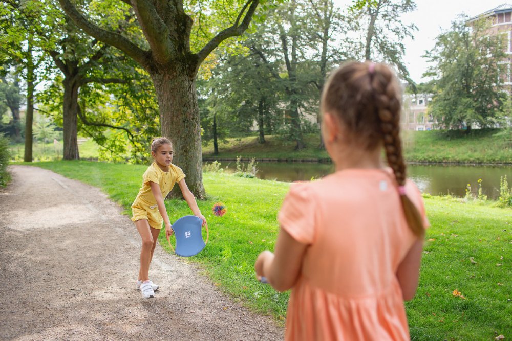 Hra pro 2 hráče od 6 let. Tento sportovní set je ideální i pro malé děti, protože tyto rakety lze držet oběma rukama. Kulaté rakety z bambusu a pružné látky odrážejí mezi sebou střapatý míček jako malé trampolíny. Posláním této hry je umožnit dětem bavit se bez chytrých telefonů a tabletů.