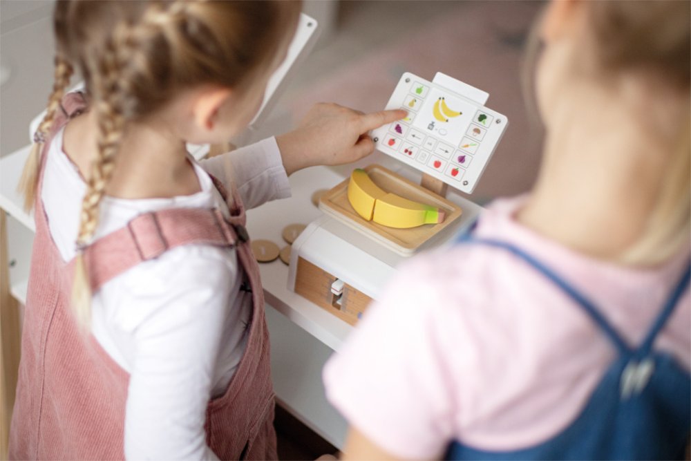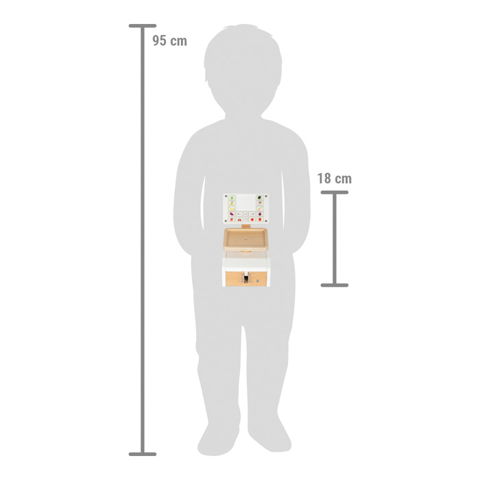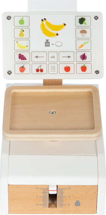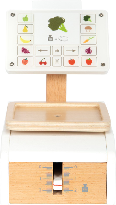 Važte ovoce a zeleninu jako v supermarketu. Tato dřevěná váha s velkou vážící plochou je tím pravým doplňkem pro vážení hracích potravin v obchodě, nebo v dětské kuchyňce. Integrovaný pružinový mechanismus zajišťuje obzvláště realistickou herní zábavu, protože pohyblivý ukazatel hmotnosti a vážicí miska se pohybují nahoru a dolů, když je něco položeno na váhu. Velký displej je vyroben z vysoce kvalitního akrylátového skla, který je potištěný ovládacími prvky a obrázky ovoce a zeleniny. Šest produktových karet potištěných na obou stranách s obrázky ovoce a zeleniny lze vložit shora do střední oblasti „displeje“. Tato váha z produktové řady „fresh“ je nutností v každém dobře zásobeném obchodě. Snadná ovladatelnost a jednoduchý mechanismus vážení umožňují dětem intuitivně porozumět procesu měření váhy. Aby děti pochopily různé ceny, jsou na kartách s jídlem obrázky mincí - čím více mincí je, tím dražší je vážené kilo ovoce nebo zeleniny. Vysoce kvalitní zpracování dřeva a akrylového skla dělá z váhy opravdový poutač v dětském pokoji, který slibuje dlouhotrvající zábavu. Manipulace s váhou trénuje také jemnou motoriku a koordinaci ruky a oka.