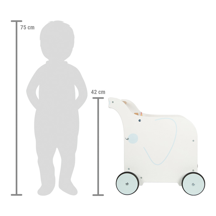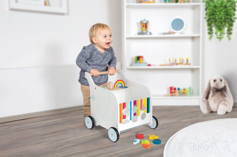 Toto chodítko je inovativní hračka navržená pro malé objevitele, kteří právě začínají svou cestu objevování světa kolem sebe. Duha a její barvy jsou krásným designovým prvkem slona. Multifunkční hračka kombinuje prvky podporující chůzi a praktického úložného prostoru na hračky. Chodítko je vybaveno pevným a bezpečným úchytem pro malé dětské ruce, což umožňuje dětem postavit se a podporuje první krůčky. V těle hračky je dostatek prostoru pro uložení oblíbených hraček. Vkládání šesti různých tvarů a posouvání posuvných dílků trénuje jemnou motoriku dětí zábavnou formou. Pogumovaná kolečka a integrovaná osa zajistí bezpečnou, stabilní a tichou jízdu.