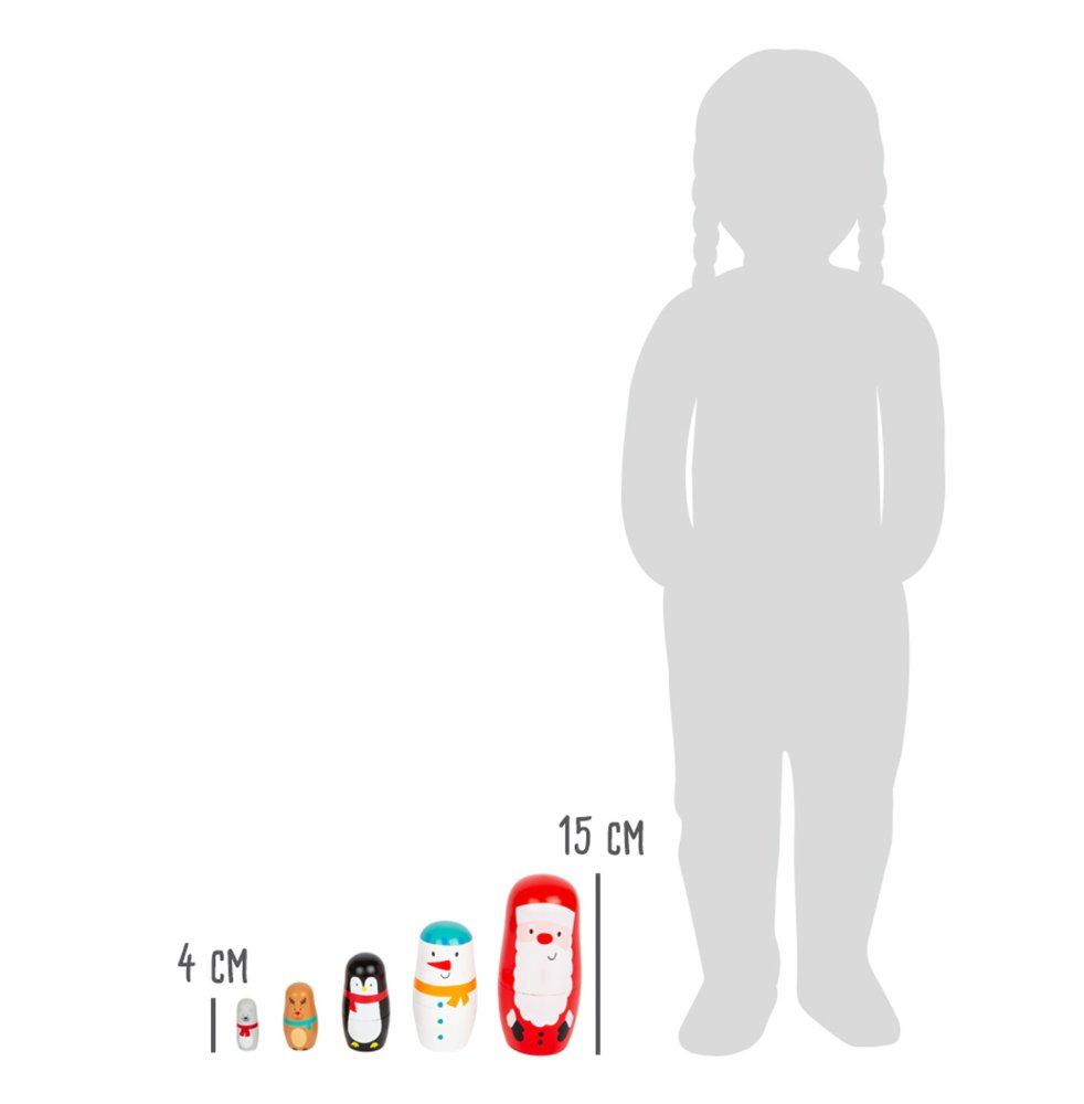 Láskyplně malované figurky v podobě Santa Clause, sněhuláka, tučňáka, soba a medvěda. Podle velikosti se postupně figurky schovávají do sebe.