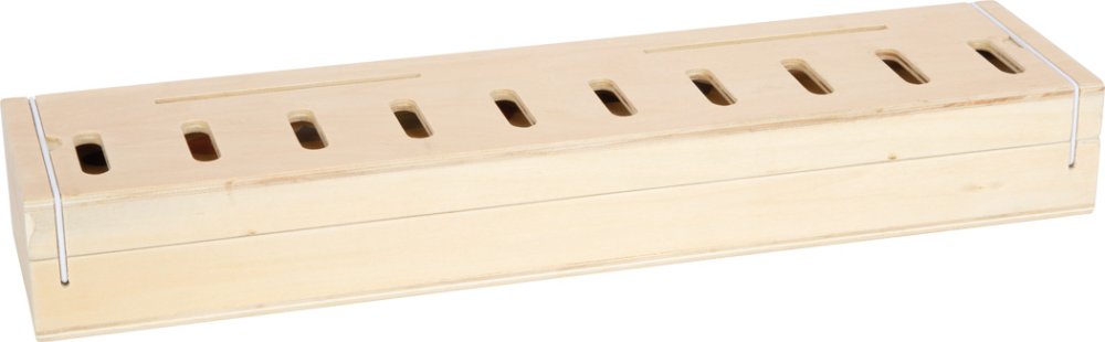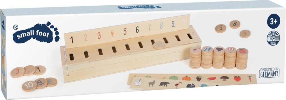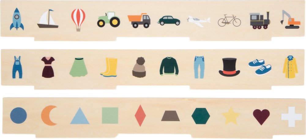 Tento dřevěný zásobník nabízí spoustu motivů k objevování se třemi oboustrannými vkládacími panely a 60 ks obrázkových žetonů na téma doprava, zvířata, čísla, tvary, oblečení, ovoce a zelenina. Při třídění a vkládání žetonu do krabičky si děti trénují jemnou motoriku, rozpoznávání barev a tvarů zábavným způsobem. Motivy lze také využít k učení slov a zdokonalování slovní zásoby zábavnou formou. Deset samostatných přihrádek uvnitř dřevěného zásobníku a dvě západky na gumičku zajišťují bezpečné uložení obsahu. Praktická učební hračka vhodná i když jste na cestách.