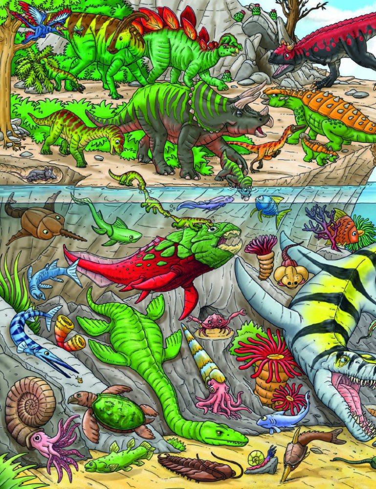 V pravěku to na zemi vypadalo úplně jinak než dnes. A hlavně tu nežili lidé! Svět byl královstvím veleještěrů zvaných dinosauři, kteří obývali všechna myslitelná prostředí. Někteří žili na souši, jiní pod vodní hladinou a teritoriem dalších byl zase vzdušný prostor. Jednotlivé druhy se proto od sebe hodně lišily. Tahle knížka vám představí pravěký svět dinosaurů v celé jeho kráse a rozmanitosti. Poznáte druhy, které létaly, plavaly, lezly, běhaly… Když se budete dobře dívat, odhalíte dokonce to, jak se jedni dinosauři bránili útokům druhých, čím se živili nebo jak přicházela na svět jejich mláďata. Někteří z ještěrů jsou vyobrazeni na každé stránce – vyzkoušejte svůj postřeh a hledejte je znovu a znovu na krásných barevných obrázcích plných roztodivných pravěkých tvorů! Na konci knihy pak najdete kompletní seznam názvů vyobrazených dinosaurů – naučte se je znát a staňte se odborníky přes tyto oblíbené pratvory!