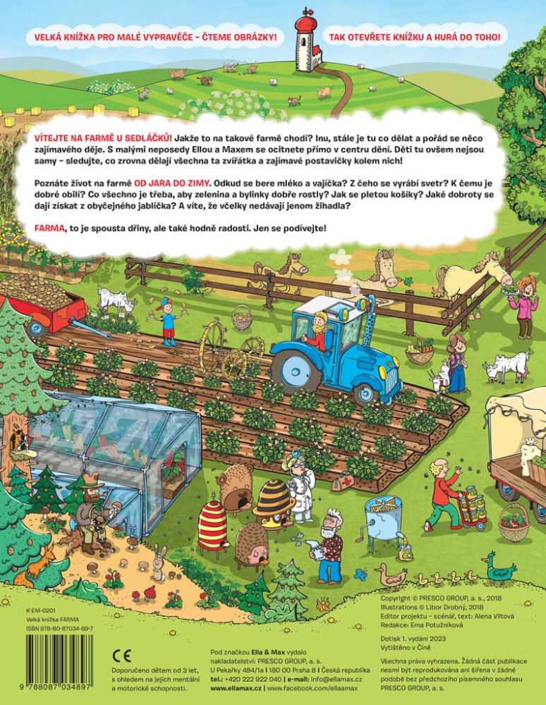 Poznáte život na farmě OD JARA DO ZIMY. Odkud se bere mléko a vajíčka? Z čeho se vyrábí svetr? K čemu je dobré obilí? Co všechno je třeba, aby zelenina a bylinky dobře rostly? Jak se pletou košíky? Jaké dobroty se dají získat z obyčejného jablíčka? A víte, že včelky nedávají jenom žihadla?