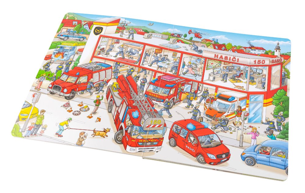 Rychle si navlékli výstroj, nasadili přilby a už se řítí se zapnutou houkačkou k hořícímu domu. Rychle připravit dlouhý hasičský žebřík a stříkačky a hasíme! Je třeba vyprostit z plamenů nešťastníky, kteří nestačili včas utéct před ohněm a zůstali uvězněni v domě. To je také práce hasičů: odvážně se vrhají do plamenů, aby před požárem zachránili všechno živé. Detailní ilustrace v další z řady velkých obrázkových knih seznámí malé čtenáře s rozmanitou prací hasiče i s každodenním životem na stanici. Stačí se jen ponořit do barevného světa obrázků a pozorně sledovat.