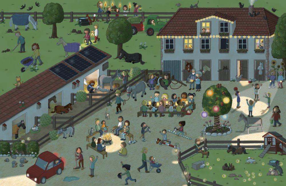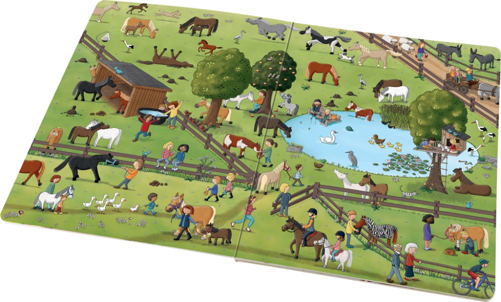 V téhle velké obrázkové knížce prožijete úžasný den mezi koni a poníky. Na velkoformátových ilustracích můžete tyto krásné a ušlechtilé tvory obdivovat. Nahlédnete do každodenního života na koňské farmě, vyrazíte na projížďku, budete fandit na dostizích nebo sledovat hřebce, klisny a hříbátka na pastvě. Poznáte, co všechno obnáší péče o tato zvířata, co mají ráda nebo při jakých činnostech mohou člověku pomáhat. Některé postavičky a zvířátka můžete hledat na každé dvojstránce znovu a znovu a sledovat jejich příběhy. Je to docela fuška, ale hlavně velká zábava!